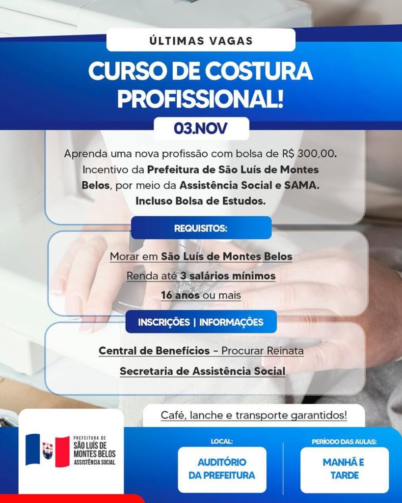 A Prefeitura de São Luís de Montes Belos, por meio da Secretaria de Assistência Social e do SAMA, está com as últimas vagas abertas para o Curso de Costura Profissional, que oferece bolsa de estudos de R$ 300,00 aos participantes.