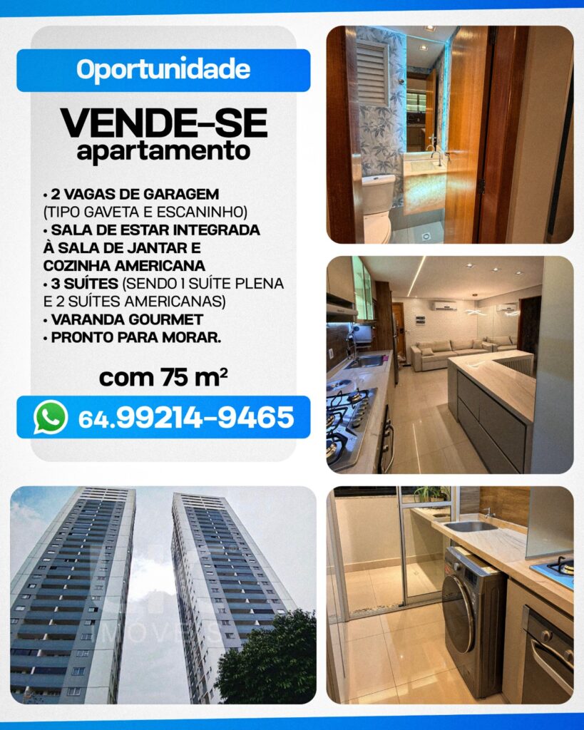 Vende-se um apartamento em Goiânia pronto para morar e que tem três suítes, sendo uma plena e outra no estilo americana. O apartamento tem 75 metros quadrados. Tem duas vagas de garagem, tipo gaveta e escaminho. Apartamento com sala de jantar e cozinha americana. Tem varanda gourmet. Está pronto para morar. Fica a 500 m do Buriti Shopping, a 300 da Av.  Rio verde, Está na  Av. Marialva N° 435, Vila Rosa Goiania – Goias. Apt 1904ª, Sol Nascente.Contato: 64 99214-9465.