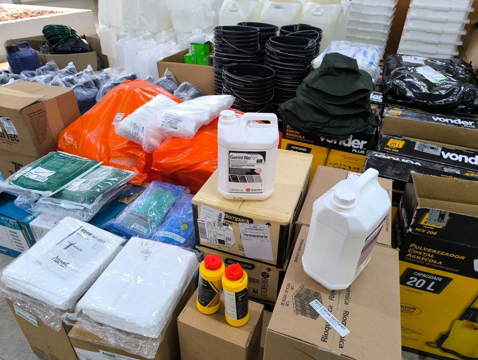 Entre os EPIs e insumos adquiridos estão máscaras de proteção facial, macacões, luvas, chapéus, aventais e botas plásticas; testes para o processo de esterilização a vapor saturado; baldes, escovas, caixas multiuso, caixas frigoríficas, bandejas, lavadoras de alta pressão, mangueiras, pulverizadores, reservatórios, bombonas, mesas, cadeiras, luminárias de emergência, garrafas térmicas e tendas.